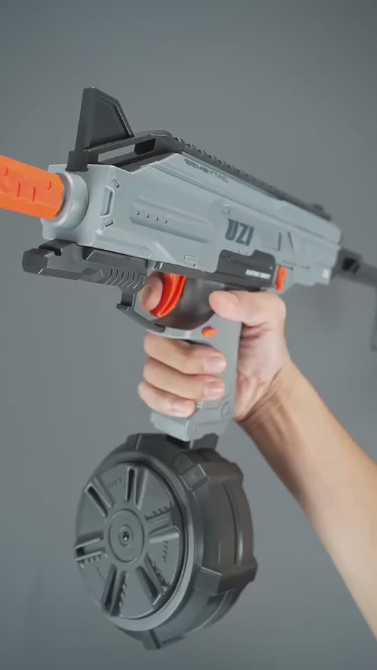 This UZI GelBlaster comes standard with a drum magazine, Buttstock and Green Dot Sight. The weapon features a "prime" function, which allows the weapon to be preloaded easily and quickly. Thanks to its nylon gearbox, the weapon has a very high shooting power.